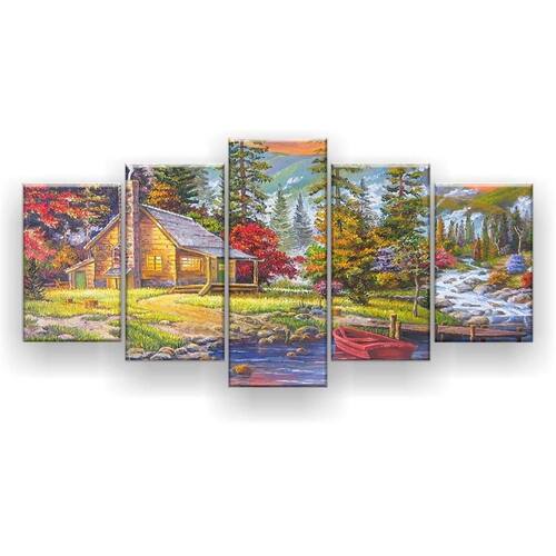 Quadro Decorativo Mosaico 5 Peças Pintura Pôr Do Sol No Lago