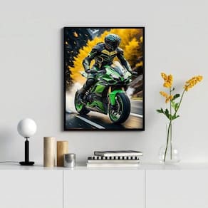 Quadro decorativo moto esportiva- motociclista 45x34cm - com vidro Moldura: madeira preta Informações do produto tire todas as suas dúvidas no descritivo abaixo: decoração para quarto, sala, cozinha, escritório, área gourmet e muito mais. Chega de paredes vazias medidas - cada peça tem 45x34cm a3 . Material do papel - papel fotográfico brilhante de altíssima resolução acabamento - todos os quadros são acompanhados de vidro para proteção da imagem. - moldura em madeira maciça na cor preta ou branca conforme produto escolhido e pendurador . - os quadros são embalados de forma segura com plástico bolha com camada dupla de acordo com o tamanho dos quadros. Garantia - garantia de 3 meses. Meu quadro chegou. Como posso fixá-lo Você precisa apenas de um martelo e um prego, pois os quadros já vão acompanhados de penduradores. Esta é a forma mais indicada. Como posso limpar meu quadro A limpeza é feita como um móvel comum da sua casa. Apenas um pano seco ou espanador são suficientes para tal Ean: 7891598804766
