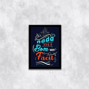Quadro decorativo nada que é bom vem fácil 34x23cm - moldura branca Tamanho: a4 20 x 30 Acabamento: película de acetato Moldura: madeira branca Informações do produto Tire todas as suas dúvidas no descritivo abaixo: Decoração para quarto, sala, cozinha, escritório, área gourmet e muito mais. Chega de paredes vazias Medidas - cada peça tem 34x23cm a4 . Material do papel - papel fotográfico brilhante de altíssima resolução Acabamento - todos os quadros são acompanhados de uma película de acetato para proteção da imagem. - moldura em madeira maciça na cor branca e pendurador móvel que pode ser retirado facilmente caso deseje fixar com fita dupla face. - os quadros são embalados de forma segura com plástico bolha com camada dupla de acordo com o tamanho dos quadros. - de 3 meses Meu quadro chegou. Como posso fixá-lo Você precisa apenas de um martelo e um prego, pois os quadros já vão acompanhados de penduradores. Esta é a forma mais indicada. Caso prefira, você pode utilizar uma fita dupla face neste caso, sugerimos de alta qualidade para evitar que descole e seu quadro caia . Como posso limpar meu quadro A limpeza é feita como um móvel comum da sua casa. Apenas um pano seco ou espanador são suficientes para tal Marca: Não Informado