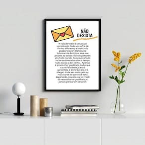 Quadro decorativo não desista- reflexão 45x34cm Moldura: madeira preta Informações do produto tire todas as suas dúvidas no descritivo abaixo: decoração para quarto, sala, cozinha, escritório, área gourmet e muito mais. Chega de paredes vazias. Medidas - cada peça tem 45x34cm a3 . Material do papel - papel fotográfico brilhante de altíssima resolução acabamento - todos os quadros são acompanhados de uma película de acetato para proteção da imagem. - os quadros são embalados de forma segura com plástico bolha com camada dupla de acordo com o tamanho dos quadros. Garantia - garantia de 3 meses. Meu quadro chegou. Como posso fixá-lo Você precisa apenas de um martelo e um prego, pois os quadros já vão acompanhados de penduradores. Esta é a forma mais indicada. Caso prefira, você pode utilizar uma fita dupla face neste caso, sugerimos de alta qualidade para evitar que descole e seu quadro caia . Como posso limpar meu quadro A limpeza é feita como um móvel comum da sua casa. Apenas um pano seco ou espanador são suficientes para tal Ean: 7893438591805