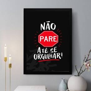 Quadro decorativo não pare até se orgulhar 24x18cm Cor: moldura preta Informações do produto tire todas as suas dúvidas no descritivo abaixo: decoração para quarto, sala, cozinha, escritório, área gourmet e muito mais. Chega de paredes vazias medidas - cada peça tem 24x18cm a5 . Material do papel - papel fotográfico brilhante de altíssima resolução acabamento - todos os quadros são acompanhados de uma película de acetato para proteção da imagem. - os quadros são embalados de forma segura com plástico bolha com camada dupla de acordo com o tamanho dos quadros. - de 3 meses. Meu quadro chegou. Como posso fixá-lo Você precisa apenas de um martelo e um prego, pois os quadros já vão acompanhados de penduradores. Esta é a forma mais indicada. Caso prefira, você pode utilizar uma fita dupla face neste caso, sugerimos de alta qualidade para evitar que descole e seu quadro caia . Como posso limpar meu quadro A limpeza é feita como um móvel comum da sua casa. Apenas um pano seco ou espanador são suficientes para tal