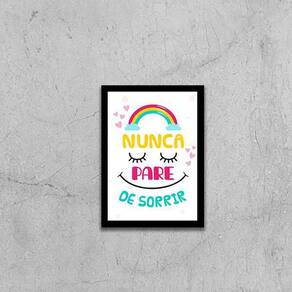 O Quadro Decorativo Nunca Pare De Sorrir da Quadros On-Line é uma excelente opção para decorar seu ambiente, tornando-o mais aconchegante, bonito e com muito estilo. Para facilitar na instalação, o quadro já vem com pendurador que pode ser removido com facilidade. O quadro é produzido com papel fotográfico brilhante de alta resolução e acompanha uma película de acetato para proteção da imagem. Além disso, vem com moldura em madeira maciça e pendurador móvel que pode ser retirado facilmente caso deseje fixar com fita dupla face. Características: - Quadro com 34x23cm com moldura - Moldura em madeira maciça preta - Produzido em papel fotográfico brilhante - Acompanha película de acetato Especificações Técnicas Produto: Quadro Decorativo Marca: Quadros On-Line Modelo: Nunca Pare De Sorrir Material: Papel Fotográfico Acabamento: Brilhante Acompanha: Película de acetato para proteção Instalação: Acompanha pendurador móvel Tamanho unidade: 34 x 23 cm : 3 meses Limpeza e conservação Para manter seus quadros sempre limpos e bem conservados a limpeza deve ser feita como em um móvel comum da sua casa. Apenas um pano seco ou um espanador já é suficiente para retirar o pó que pode se acumular nos quadros. Marca: Não Informado