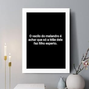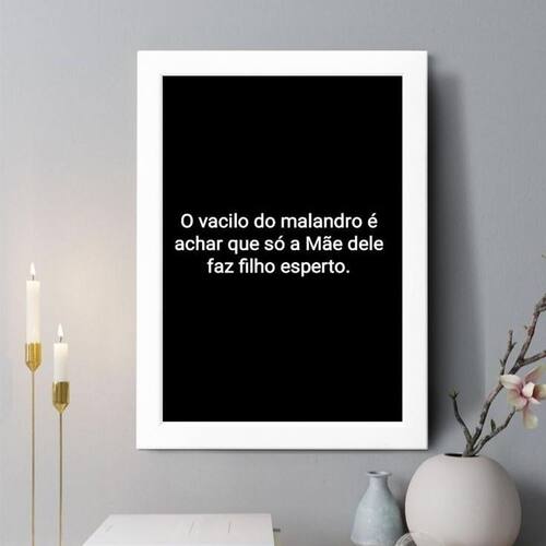 Quadro decorativo o vacilo do malandro 24x18cm - com vidro Cor: moldura preta Informações do produto tire todas as suas dúvidas no descritivo abaixo: decoração para quarto, sala, cozinha, escritório, área gourmet e muito mais. Chega de paredes vazias medidas - cada peça tem 24x18cm a5 . Material do papel - papel fotográfico brilhante de altíssima resolução acabamento - todos os quadros são acompanhados de vidro para proteção da imagem. - moldura em madeira maciça na cor preta ou branca conforme produto escolhido e pendurador . - os quadros são embalados de forma segura com plástico bolha com camada dupla de acordo com o tamanho dos quadros. Garantia - garantia de 3 meses. Meu quadro chegou. Como posso fixá-lo Você precisa apenas de um martelo e um prego, pois os quadros já vão acompanhados de penduradores. Esta é a forma mais indicada. Como posso limpar meu quadro A limpeza é feita como um móvel comum da sua casa. Apenas um pano seco ou espanador são suficientes para tal