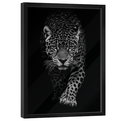 Quadro Decorativo Onça no Preto Moldura Preta e Vidro - 84x54cm -