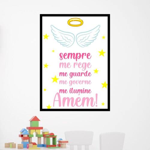 Quadro Decorativo Oração - Anjo da Guarda Rosa - Tamanho: A4 (20 x 30) / Acabamento: Película de acetato / Moldura: Madeira preta