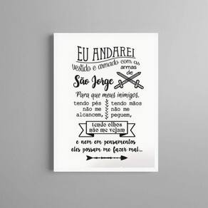 Quadro decorativo oração para são jorge 33x24cm - com vidro Cor: moldura branca Informações do produto tire todas as suas dúvidas no descritivo abaixo: decoração para quarto, sala, cozinha, escritório, área gourmet e muito mais. Chega de paredes vazias medidas - cada peça tem 33x24cm a4 . Material do papel - papel fotográfico brilhante de altíssima resolução acabamento - todos os quadros são acompanhados de vidro para proteção da imagem. - moldura em madeira maciça na cor preta ou branca conforme produto escolhido e pendurador . - os quadros são embalados de forma segura com plástico bolha com camada dupla de acordo com o tamanho dos quadros. Garantia - garantia de 3 meses. Meu quadro chegou. Como posso fixá-lo Você precisa apenas de um martelo e um prego, pois os quadros já vão acompanhados de penduradores. Esta é a forma mais indicada. Como posso limpar meu quadro A limpeza é feita como um móvel comum da sua casa. Apenas um pano seco ou espanador são suficientes para tal