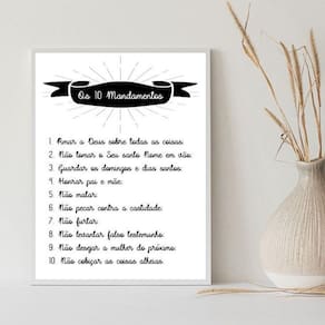 Quadro decorativo os 10 mandamentos 33x24cm Cor: moldura branca Informações do produto tire todas as suas dúvidas no descritivo abaixo: decoração para quarto, sala, cozinha, escritório, área gourmet e muito mais. Chega de paredes vazias medidas - cada peça tem 33x24cm a4 . Material do papel - papel fotográfico brilhante de altíssima resolução acabamento - todos os quadros são acompanhados de uma película de acetato para proteção da imagem. - os quadros são embalados de forma segura com plástico bolha com camada dupla de acordo com o tamanho dos quadros. - de 3 meses. Meu quadro chegou. Como posso fixá-lo Você precisa apenas de um martelo e um prego, pois os quadros já vão acompanhados de penduradores. Esta é a forma mais indicada. Caso prefira, você pode utilizar uma fita dupla face neste caso, sugerimos de alta qualidade para evitar que descole e seu quadro caia . Como posso limpar meu quadro A limpeza é feita como um móvel comum da sua casa. Apenas um pano seco ou espanador são suficientes para tal Marca: Não Informado