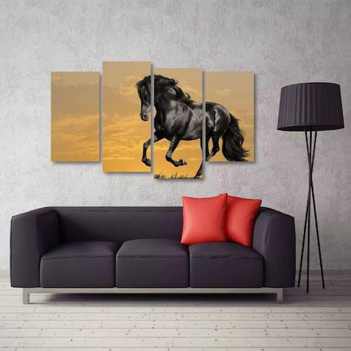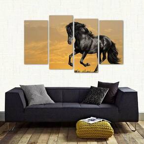 Quadro Decorativo Paisagem Cavalo Preto Sala Tecido 4 Peças