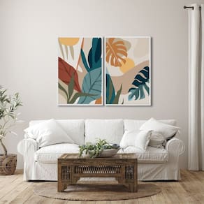 Quadro Decorativo Paisagem Tropical Plantas e Folhas com 2 Telas de Parede para Sala Quarto Escritór Branco