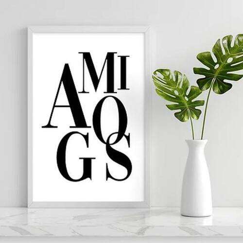 Quadro decorativo palavra amigos 33x24cm - com vidro Moldura: madeira branca Informações do produto Decoração para quarto, sala, cozinha, escritório, área gourmet e muito mais. Chega de paredes vazias Medidas - cada peça tem 33x24cm a4 . Material do papel - papel fotográfico brilhante de altíssima resolução Acabamento - todos os quadros são acompanhados de vidro para proteção da imagem. - Os quadros são embalados de forma segura com plástico bolha com camada dupla de acordo com o tamanho dos quadros. - de 3 meses. Meu quadro chegou. Como posso fixá-lo Você precisa apenas de um martelo e um prego, pois os quadros já vão acompanhados de penduradores. Esta é a forma mais indicada. Como posso limpar meu quadro A limpeza é feita como um móvel comum da sua casa. Apenas um pano seco ou espanador são suficientes para tal Ean: 7895142195591
