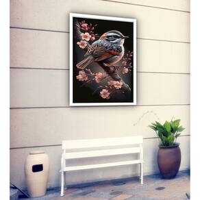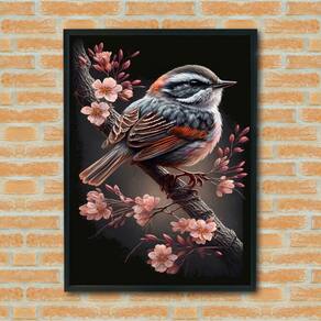 Quadro Decorativo Pássaro Filhote Ramo Flores - 70x50cm - Cor: Moldura Branca