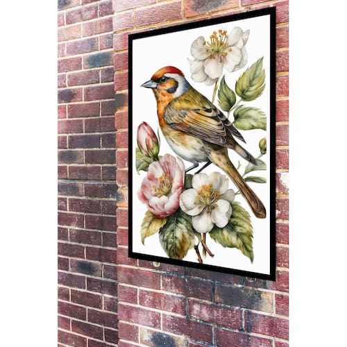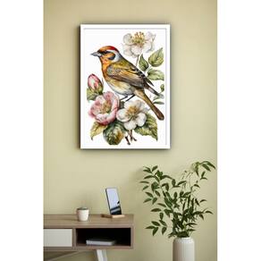 Quadro Decorativo Pássaro Flores Branca e Rosa - 70x50cm - Cor: Moldura Preta