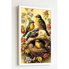 Quadro Decorativo Pássaros Ninho Flores - 70x50cm - Cor: Moldura Preta
