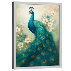 Quadro Decorativo Pavão Estilo Pintura Moldura Branca - 84x54cm -