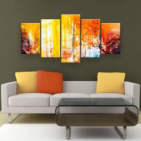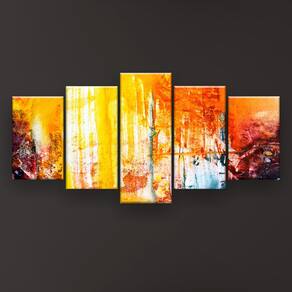 Quadro Decorativo Pintura Abstrata Amarela 129X61 5 Peças Tamanho total: 129cm comprimento X 61cm altura Peças menores: 25x40 cm Peças médias: 25x50 cm Peça central: 25x61 cm Espaçamento entre as peças: 1 cm A instalação é bem simples, pois utilizamos o método tradicional, pendurado com preguinhos. Acompanha um gabarito para facilitar a aplicação. A aplicação com o gabarito que enviamos é prática e rápida. Para limpeza, utilize apenas um pano umedecido com água sem produtos químicos para garantir a durabilidade. Nossos quadros são impressos em vinil semi-fosco de alta qualidade, aplicado em Madeira MDF com espessura de 6mm + base de madeira MDF de 9mm Total 15mm Não necessita de moldura, pois o acabamento das bordas/laterais é feito com a própria imagem impressa. Impressão em alta qualidade. Imagens em HD Alta Definição Mínimo de 12000 pixels. Marca: Não Informado