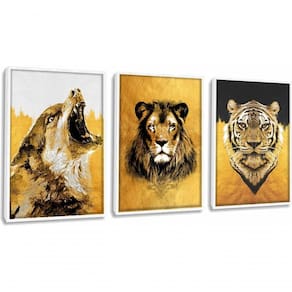 Quadro Decorativo Pintura Lobo, Leão, Tigre Com Moldura Branco