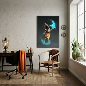 Quadro Decorativo Pocahontas e Pássaro Azul - 70x50cm - Cor: Moldura Preta