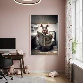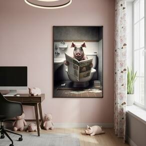 Quadro Decorativo Porco Lendo Jornal 70x50cm Mold Branca