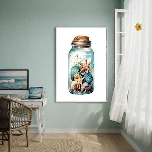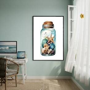 Quadro Decorativo Potinho Com EstrelasDoMar-70x50cm - Cor: Moldura Preta