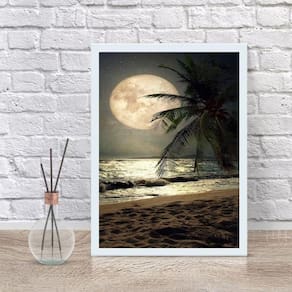 Quadro decorativo praia com lua cheia 24x18cm - com vidro Moldura: madeira preta Informações do produto tire todas as suas dúvidas no descritivo abaixo: decoração para quarto, sala, cozinha, escritório, área gourmet e muito mais. Chega de paredes vazias medidas - cada peça tem 24x18cm a5 . Material do papel - papel fotográfico brilhante de altíssima resolução acabamento - todos os quadros são acompanhados de vidro para proteção da imagem. - moldura em madeira maciça na cor preta ou branca conforme produto escolhido e pendurador . - os quadros são embalados de forma segura com plástico bolha com camada dupla de acordo com o tamanho dos quadros. Garantia - garantia de 3 meses. Meu quadro chegou. Como posso fixá-lo Você precisa apenas de um martelo e um prego, pois os quadros já vão acompanhados de penduradores. Esta é a forma mais indicada. Como posso limpar meu quadro A limpeza é feita como um móvel comum da sua casa. Apenas um pano seco ou espanador são suficientes para tal Ean: 7896222788443