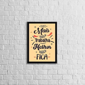 O Quadro Decorativo Quanto Mais Você Trabalha Melhor Você Fica da Quadros On-Line é uma excelente opção para decorar seu ambiente, tornando-o mais aconchegante, bonito e com muito estilo. Para facilitar na instalação, o quadro já vem com pendurador que pode ser removido com facilidade. O quadro é produzido com papel fotográfico brilhante de alta resolução e acompanha uma película de acetato para proteção da imagem. Além disso, vem com moldura em madeira maciça e pendurador móvel que pode ser retirado facilmente caso deseje fixar com fita dupla face. Características: - Quadro com 34x23cm com moldura - Moldura em madeira maciça preta - Produzido em papel fotográfico brilhante - Acompanha película de acetato Especificações Técnicas Produto: Quadro Decorativo Marca: Quadros On-Line Modelo: Quanto Mais Você Trabalha Melhor Você Fica Material: Papel Fotográfico Acabamento: Brilhante Acompanha: Película de acetato para proteção Instalação: Acompanha pendurador móvel Tamanho unidade: 34 x 23 cm : 3 meses Limpeza e conservação Para manter seus quadros sempre limpos e bem conservados a limpeza deve ser feita como em um móvel comum da sua casa. Apenas um pano seco ou um espanador já é suficiente para retirar o pó que pode se acumular nos quadros.