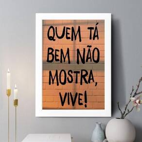 Quadro decorativo quem tá bem não mostra vive 45x34cm - com vidro Cor: moldura branca Informações do produto tire todas as suas dúvidas no descritivo abaixo: decoração para quarto, sala, cozinha, escritório, área gourmet e muito mais. Chega de paredes vazias medidas - cada peça tem 45x34cm a3 . Material do papel - papel fotográfico brilhante de altíssima resolução acabamento - todos os quadros são acompanhados de vidro para proteção da imagem. - moldura em madeira maciça na cor preta ou branca conforme produto escolhido e pendurador . - os quadros são embalados de forma segura com plástico bolha com camada dupla de acordo com o tamanho dos quadros. Garantia - garantia de 3 meses. Meu quadro chegou. Como posso fixá-lo Você precisa apenas de um martelo e um prego, pois os quadros já vão acompanhados de penduradores. Esta é a forma mais indicada. Como posso limpar meu quadro A limpeza é feita como um móvel comum da sua casa. Apenas um pano seco ou espanador são suficientes para tal