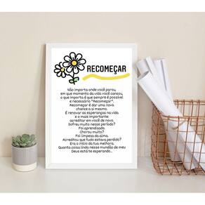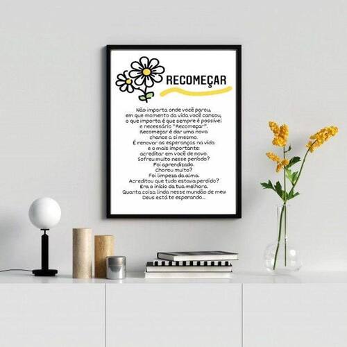 Quadro decorativo recomeçar- reflexão 24x18cm Moldura: madeira branca Informações do produto tire todas as suas dúvidas no descritivo abaixo: decoração para quarto, sala, cozinha, escritório, área gourmet e muito mais. Chega de paredes vazias medidas - cada peça tem 24x18cm a5 . Material do papel - papel fotográfico brilhante de altíssima resolução acabamento - todos os quadros são acompanhados de uma película de acetato para proteção da imagem. - os quadros são embalados de forma segura com plástico bolha com camada dupla de acordo com o tamanho dos quadros. Garantia - garantia de 3 meses. Meu quadro chegou. Como posso fixá-lo Você precisa apenas de um martelo e um prego, pois os quadros já vão acompanhados de penduradores. Esta é a forma mais indicada. Caso prefira, você pode utilizar uma fita dupla face neste caso, sugerimos de alta qualidade para evitar que descole e seu quadro caia . Como posso limpar meu quadro A limpeza é feita como um móvel comum da sua casa. Apenas um pano seco ou espanador são suficientes para tal Ean: 7890094076837