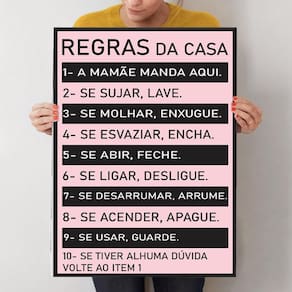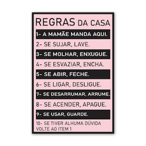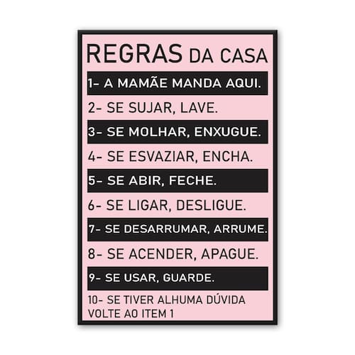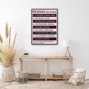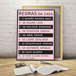 Quadro Decorativo Regras Da Casa Sabe aquela sensação agradável, harmônica, bonita que sentimos em alguns lugares Agora você também pode ter essa sensação em sua casa, de forma simples A arte quadro, possui o quadro ideal para decorar seu espaço deixando sua casa, empresa ou escritório lindos e moderno e no seu estilo Por que escolher arte quadro Porque trabalhamos diariamente, buscando os melhores resultados e atendimento para agradas todos nossos clientes, pois você é nossa prioridade Cada quadro nosso é minuciosamente trabalhado em nossa produção própria, garantindo os mais altos níveis de qualidade, pois acreditamos que um ambiente harmônico afeta diretamente seu humor, desempenho e sentimentos. Além disso, basta retirar o produto da embalagem e pendurar em sua parede, e está pronto seu ambiente passa a ser único e dá destaque em quem você é. Pensando nisso, desenvolvemos quadros com uma ampla variedade de estilos, podendo também personalizar com a foto ou medida que desejar. Para que possa encontrar o quadro perfeito, e que tenha a sua cara. Medidas do produto - 1 peça na medida de 40 cm de comprimento e 60 cm de largura com 2cm de espessura. Material - trabalhamos com o tecido canvas que é um material especial para impressão 100% algodão, com uma preparação especial resinada anti-mofo. Apropriada para impressões de obras de artes e impressão de fotos em tela, muito Utilizado em exposições nos museus tornando assim seu quadro ainda mais belo. Instalação e limpeza - a instalação é bem simples pode utilizado o método tradicional, pendurado com prego e martelo. Ou se preferir pode ser fixado com buchas e parafusos. - para limpeza, utilize apenas um pano umedecido com água sem produtos químicos , recomendamos também que o produto não fique exposto a muita umidade e a muito sol, para garantir a durabilidade da cor. Seu quadro chegue quebrado - isso é muito difícil de acontecer porém, caso aconteça, basta nos enviar uma mensagem explicando o que houve e nos enviando fotos das que enviaremos outra peça sem nenhuma burocracia ou custo adicional Poderei rastrear meu pedido - claro assim que seu quadro for despachado, enviaremos todas informações de rastreamento para que você fique ciente do momento em que ele sair daqui até chegar em sua casa. O quadro é pintado a mão - não. Seguindo as tendências de decoração atuais, nossas artes são impressas em tecido canvas e grampeados em bastidores de madeira.