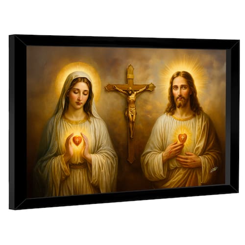 Quadro Decorativo Sagrado Coração de Jesus e Maria Moldura Preta - 150x100cm -