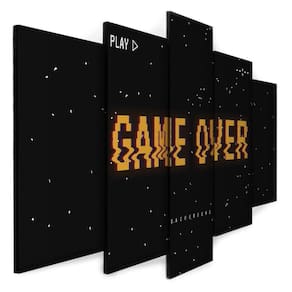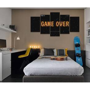 Quadro Decorativo Sala Quarto Escritório Game Over Os quadros decorativos são uma tendência e excelente ideia para quem desejar realmente mudar o visual do seu ambiente, deixando ele com a sua cara. São Utilizados para decorar vários ambientes seja um comércio, sua sala, quarto, área de lazer ou escritório, são lindos, leves e fáceis de instalar. Também pode quebrar aquele galho tampando aquelas pequenas imperfeições indesejadas da parede, com um toque super elegante. Decorar o seu ambiente é sempre um momento muito especial. Características do Produto: Tamanho total: 130cm comprimento X 63cm altura Peças menores: 25x40 cm | Peças médias: 25x51 cm | Peça central: 25x63 cm Espaçamento entre as peças: 1 cm a 2 cm Espessura do produto - 2 CM Quadro pronto para pendurar no local desejado. Material e Acabamentos: Tela em Tecido com impressão digital ecológica, de alta tecnologia, Atóxica e sem cheiro, proporcionando imagens de alta qualidade e durabilidade. Bordas com a extensão da própria imagem nas laterais, sendo uma tela painel. Tecido esticado no chassi de madeira e grampeado no verso, com suportes triangulares para a fixação. Um pouco mais sobre o Tecido O tecido é sintético fechado, sua flexibilidade evita que a impressão fique com aparência pigmentada, caso o material seja esticado. É muito utilizado em museus, exposições de arte, eventos, na identificação e principalmente Na decoração de ambientes. Como fixar no local: Fixação feita de forma tradicional, basta colocar dois parafusos ou dois pregos de acordo com os engates do quadro, Deixando espaçamento entre as peças de 1,5 CM ou até no máximo 2,5 CM. Limpeza após fixação: Para a limpeza basta apenas um espanador ou pano macio, sem conter elementos químicos. Objetos/móveis ilustrativos da imagens não inclusos somente o quadro. O Produto pode de ocorrer de ter uma leve diferença de tom de cor da que esta no monitor do seu computador. O Produto é produzido e postado em até 3 dias úteis após a confirmação do pagamento. Ean: 7891916113471