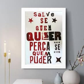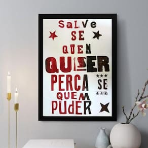 Quadro decorativo salve-se quem quiser 33x24cm Cor: moldura branca Informações do produto tire todas as suas dúvidas no descritivo abaixo: decoração para quarto, sala, cozinha, escritório, área gourmet e muito mais. Chega de paredes vazias medidas - cada peça tem 33x24cm a4 . Material do papel - papel fotográfico brilhante de altíssima resolução acabamento - todos os quadros são acompanhados de uma película de acetato para proteção da imagem. - os quadros são embalados de forma segura com plástico bolha com camada dupla de acordo com o tamanho dos quadros. Garantia - garantia de 3 meses. Meu quadro chegou. Como posso fixá-lo Você precisa apenas de um martelo e um prego, pois os quadros já vão acompanhados de penduradores. Esta é a forma mais indicada. Caso prefira, você pode utilizar uma fita dupla face neste caso, sugerimos de alta qualidade para evitar que descole e seu quadro caia . Como posso limpar meu quadro A limpeza é feita como um móvel comum da sua casa. Apenas um pano seco ou espanador são suficientes para tal