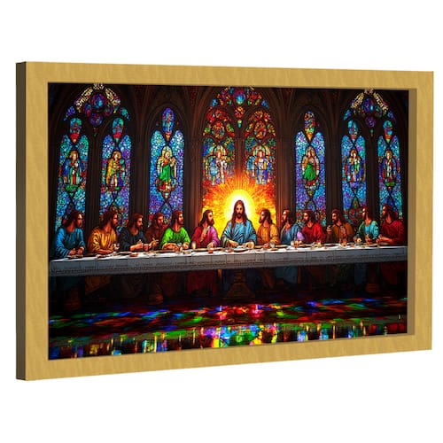 Quadro Decorativo Santa Ceia Estilo Vitral Moldura Dourada - 118x78cm -