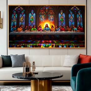 Quadro Decorativo Santa Ceia Estilo Vitral Moldura Preta e Vidro - 180x105cm -