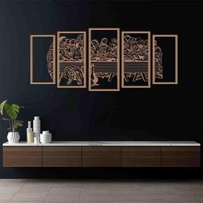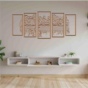 Tamanho total: 129cm comprimento x 60cm altura com espaçamento recomendado de 1 cm entre peças, Peças laterais: 40x25 cm peças intermediárias: 50x25 cm peça central: 60x25 cm Espaçamento entre as peças: 1 cm A instalação é bem simples, não será preciso fazer sujeira furando a parede pois utilizamos o método bem prático para instalar, contém fita dupla face 3m no verso do quadro.