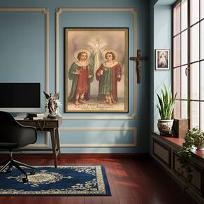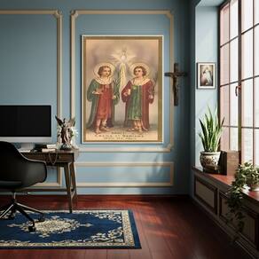 Quadro Decorativo Santos Cosme e Damião - 70x50cm - Cor: Moldura Branca