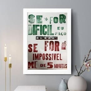 Quadro decorativo se for difícil 24x18cm Cor: moldura preta Informações do produto tire todas as suas dúvidas no descritivo abaixo: decoração para quarto, sala, cozinha, escritório, área gourmet e muito mais. Chega de paredes vazias medidas - cada peça tem 24x18cm a5 . Material do papel - papel fotográfico brilhante de altíssima resolução acabamento - todos os quadros são acompanhados de uma película de acetato para proteção da imagem. - os quadros são embalados de forma segura com plástico bolha com camada dupla de acordo com o tamanho dos quadros. Garantia - garantia de 3 meses. Meu quadro chegou. Como posso fixá-lo Você precisa apenas de um martelo e um prego, pois os quadros já vão acompanhados de penduradores. Esta é a forma mais indicada. Caso prefira, você pode utilizar uma fita dupla face neste caso, sugerimos de alta qualidade para evitar que descole e seu quadro caia . Como posso limpar meu quadro A limpeza é feita como um móvel comum da sua casa. Apenas um pano seco ou espanador são suficientes para tal