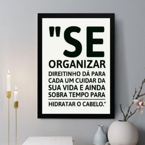 Quadro decorativo se organizar direitinho 24x18cm Cor: moldura preta Informações do produto tire todas as suas dúvidas no descritivo abaixo: decoração para quarto, sala, cozinha, escritório, área gourmet e muito mais. Chega de paredes vazias medidas - cada peça tem 24x18cm a5 . Material do papel - papel fotográfico brilhante de altíssima resolução acabamento - todos os quadros são acompanhados de uma película de acetato para proteção da imagem. - os quadros são embalados de forma segura com plástico bolha com camada dupla de acordo com o tamanho dos quadros. Garantia - garantia de 3 meses. Meu quadro chegou. Como posso fixá-lo Você precisa apenas de um martelo e um prego, pois os quadros já vão acompanhados de penduradores. Esta é a forma mais indicada. Caso prefira, você pode utilizar uma fita dupla face neste caso, sugerimos de alta qualidade para evitar que descole e seu quadro caia . Como posso limpar meu quadro A limpeza é feita como um móvel comum da sua casa. Apenas um pano seco ou espanador são suficientes para tal