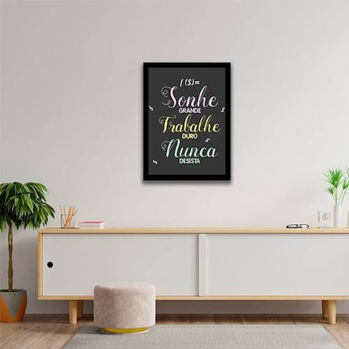 Quadro Decorativo Sonhe Grande, Trabalhe Duro, Nunca Desista - Tamanho: A4 (20 x 30) / Acabamento: Película de acetato / Moldura: Madeira preta