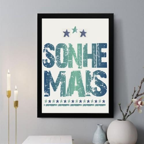 Quadro decorativo sonhe mais 24x18cm - com vidro Cor: moldura preta Informações do produto tire todas as suas dúvidas no descritivo abaixo: decoração para quarto, sala, cozinha, escritório, área gourmet e muito mais. Chega de paredes vazias medidas - cada peça tem 24x18cm a5 . Material do papel - papel fotográfico brilhante de altíssima resolução acabamento - todos os quadros são acompanhados de vidro para proteção da imagem. - moldura em madeira maciça na cor preta ou branca conforme produto escolhido e pendurador . - os quadros são embalados de forma segura com plástico bolha com camada dupla de acordo com o tamanho dos quadros. Garantia - garantia de 3 meses. Meu quadro chegou. Como posso fixá-lo Você precisa apenas de um martelo e um prego, pois os quadros já vão acompanhados de penduradores. Esta é a forma mais indicada. Como posso limpar meu quadro A limpeza é feita como um móvel comum da sua casa. Apenas um pano seco ou espanador são suficientes para tal