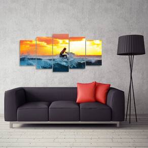 Quadro decorativo Surf Mar Pôr do Sol Dimensões do Produto: Tamanho total do produto: 125x60 cm Comprimento x Altura 02 Peças menores: 25x40 cm 02 Peças Médias: 25x50 cm 01 Peça Central: 25x60 cm. Espaçamento entre as peças de 1 cm - Tamanho total com espaçamentos 129x60 cm. Espessura do produto - 9 mm