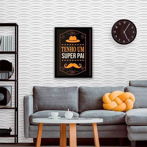 O Quadro Decorativo Tenho Um Super Pai da Quadros On-Line é uma excelente opção para decorar seu ambiente, tornando-o mais aconchegante, bonito e com muito estilo. Para facilitar na instalação, o quadro já vem com pendurador que pode ser removido com facilidade. O quadro é produzido com papel fotográfico brilhante de alta resolução e acompanha uma película de acetato para proteção da imagem. Além disso, vem com moldura em madeira maciça e pendurador móvel que pode ser retirado facilmente caso deseje fixar com fita dupla face. Características: - Quadro com 34x23cm com moldura - Moldura em madeira maciça preta - Produzido em papel fotográfico brilhante - Acompanha película de acetato Especificações Técnicas Produto: Quadro Decorativo Marca: Quadros On-Line Modelo: Tenho Um Super Pai Material: Papel Fotográfico Acabamento: Brilhante Acompanha: Película de acetato para proteção Instalação: Acompanha pendurador móvel Tamanho unidade: 34 x 23 cm : 3 meses Limpeza e conservação Para manter seus quadros sempre limpos e bem conservados a limpeza deve ser feita como em um móvel comum da sua casa. Apenas um pano seco ou um espanador já é suficiente para retirar o pó que pode se acumular nos quadros.