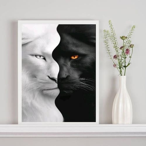 Quadro decorativo tigre branco preto - metades 33x24cm - com vidro Cor: moldura preta Informações do produto tire todas as suas dúvidas no descritivo abaixo: decoração para quarto, sala, cozinha, escritório, área gourmet e muito mais. Chega de paredes vazias medidas - cada peça tem 33x24cm a4 . Material do papel - papel fotográfico brilhante de altíssima resolução acabamento - todos os quadros são acompanhados de vidro para proteção da imagem. - moldura em madeira maciça na cor preta ou branca conforme produto escolhido e pendurador . - os quadros são embalados de forma segura com plástico bolha com camada dupla de acordo com o tamanho dos quadros. - de 3 meses. Meu quadro chegou. Como posso fixá-lo Você precisa apenas de um martelo e um prego, pois os quadros já vão acompanhados de penduradores. Esta é a forma mais indicada. Como posso limpar meu quadro A limpeza é feita como um móvel comum da sua casa. Apenas um pano seco ou espanador são suficientes para tal