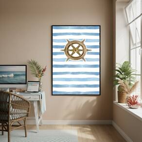 Quadro Decorativo Timão Navio Fundo Listrado-70x50cm - Cor: Moldura Branca
