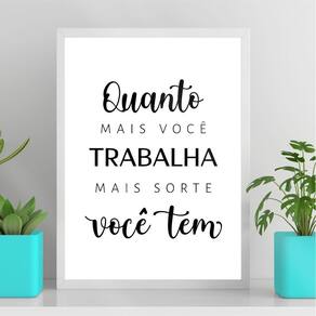 Quadro decorativo trabalho e sorte 45x34cm - com vidro Cor: moldura preta Informações do produto tire todas as suas dúvidas no descritivo abaixo: decoração para quarto, sala, cozinha, escritório, área gourmet e muito mais. Chega de paredes vazias medidas - cada peça tem 45x34cm a3 . Material do papel - papel fotográfico brilhante de altíssima resolução acabamento - todos os quadros são acompanhados de vidro para proteção da imagem. - moldura em madeira maciça na cor preta ou branca conforme produto escolhido e pendurador . - os quadros são embalados de forma segura com plástico bolha com camada dupla de acordo com o tamanho dos quadros. - de 3 meses. Meu quadro chegou. Como posso fixá-lo Você precisa apenas de um martelo e um prego, pois os quadros já vão acompanhados de penduradores. Esta é a forma mais indicada. Como posso limpar meu quadro A limpeza é feita como um móvel comum da sua casa. Apenas um pano seco ou espanador são suficientes para tal Ean: 7891234553454
