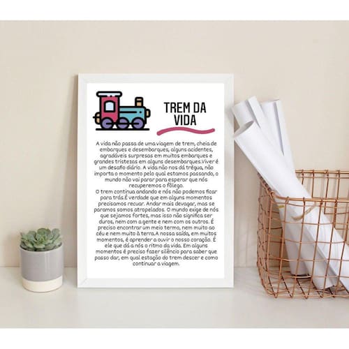 Quadro decorativo trem da vida 33x24cm Moldura: madeira preta Informações do produto tire todas as suas dúvidas no descritivo abaixo: decoração para quarto, sala, cozinha, escritório, área gourmet e muito mais. Chega de paredes vazias medidas - cada peça tem 33x24cm a4 . Material do papel - papel fotográfico brilhante de altíssima resolução acabamento - todos os quadros são acompanhados de uma película de acetato para proteção da imagem. - os quadros são embalados de forma segura com plástico bolha com camada dupla de acordo com o tamanho dos quadros. Garantia - garantia de 3 meses. Meu quadro chegou. Como posso fixá-lo Você precisa apenas de um martelo e um prego, pois os quadros já vão acompanhados de penduradores. Esta é a forma mais indicada. Caso prefira, você pode utilizar uma fita dupla face neste caso, sugerimos de alta qualidade para evitar que descole e seu quadro caia . Como posso limpar meu quadro A limpeza é feita como um móvel comum da sua casa. Apenas um pano seco ou espanador são suficientes para tal Ean: 7899954504091