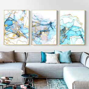 Quadro Decorativo Trio Abstrato Mármore Azul Moldura Dourada - 84x54cm -