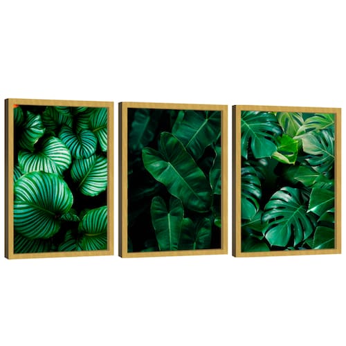 Quadro Decorativo Trio Folhas Verdes Moldura Dourada - 84x54cm -