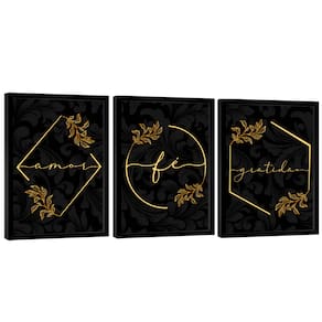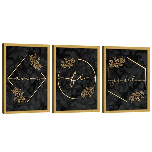 Quadro Decorativo Trio Gratidão, Fé e Amor Moldura Dourada e Vidro - 60x40cm -