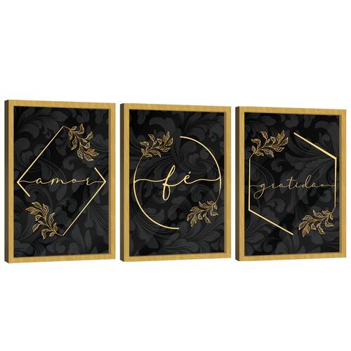 Quadro Decorativo Trio Gratidão, Fé e Amor Moldura Dourada e Vidro - 150x100cm -