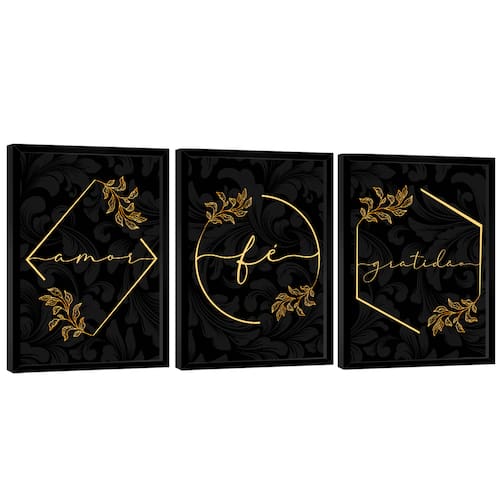 Quadro Decorativo Trio Gratidão, Fé e Amor Moldura Preta - 180x105cm -